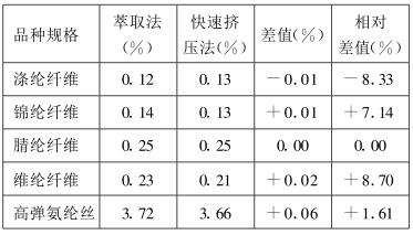 (1)用傳統的萃取法與快速擠壓法測定化纖含油率,二者之間不存在顯著差異 , 其準確度是可信的。建議國家盡快將快速擠壓法納入國標,推廣使用。